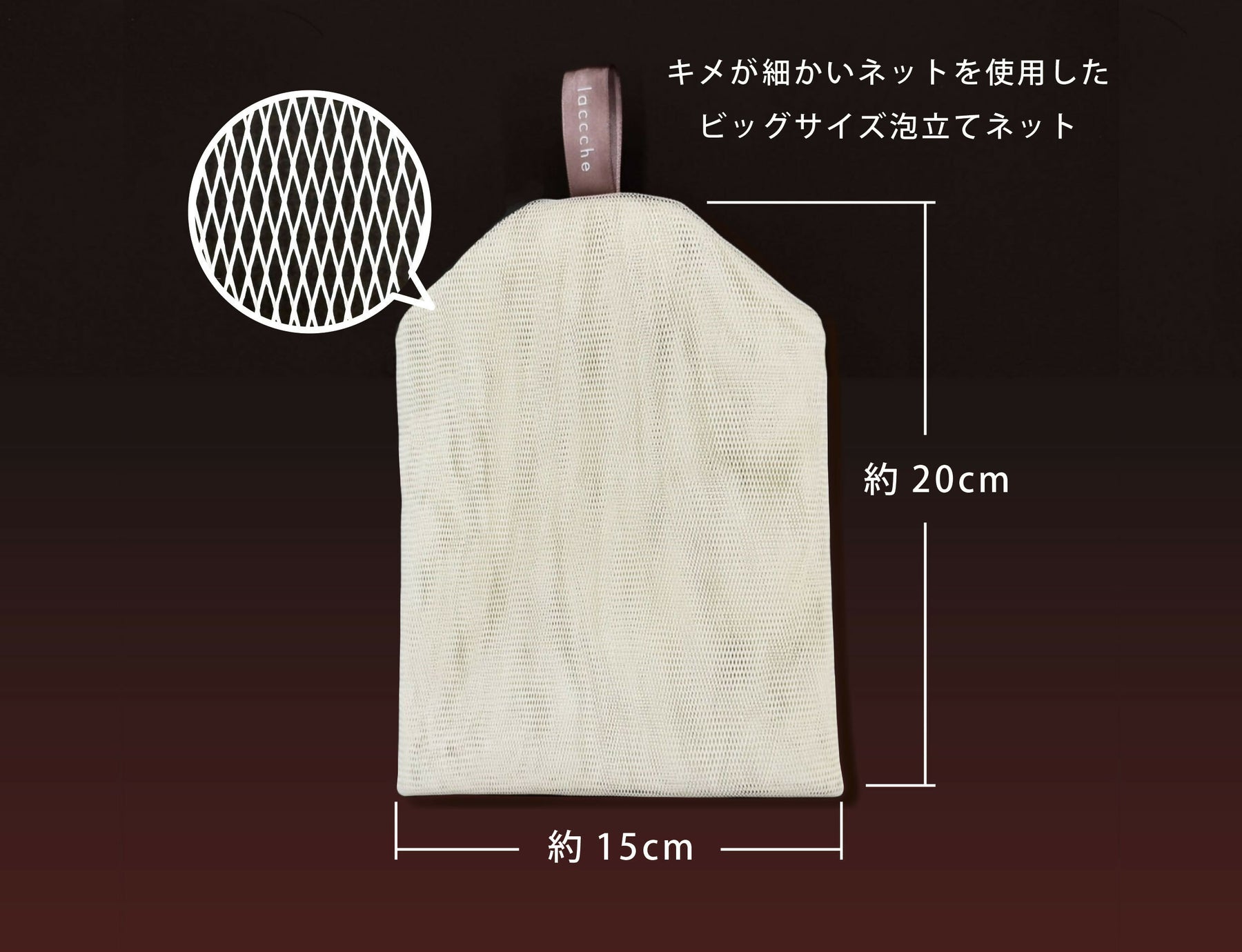 メッシュが細かく、柔らかい感触のネットを選定し大きめサイズに仕上げることで、やさしい泡をすばやく作ります。
