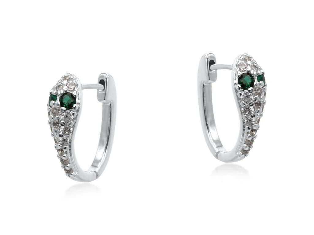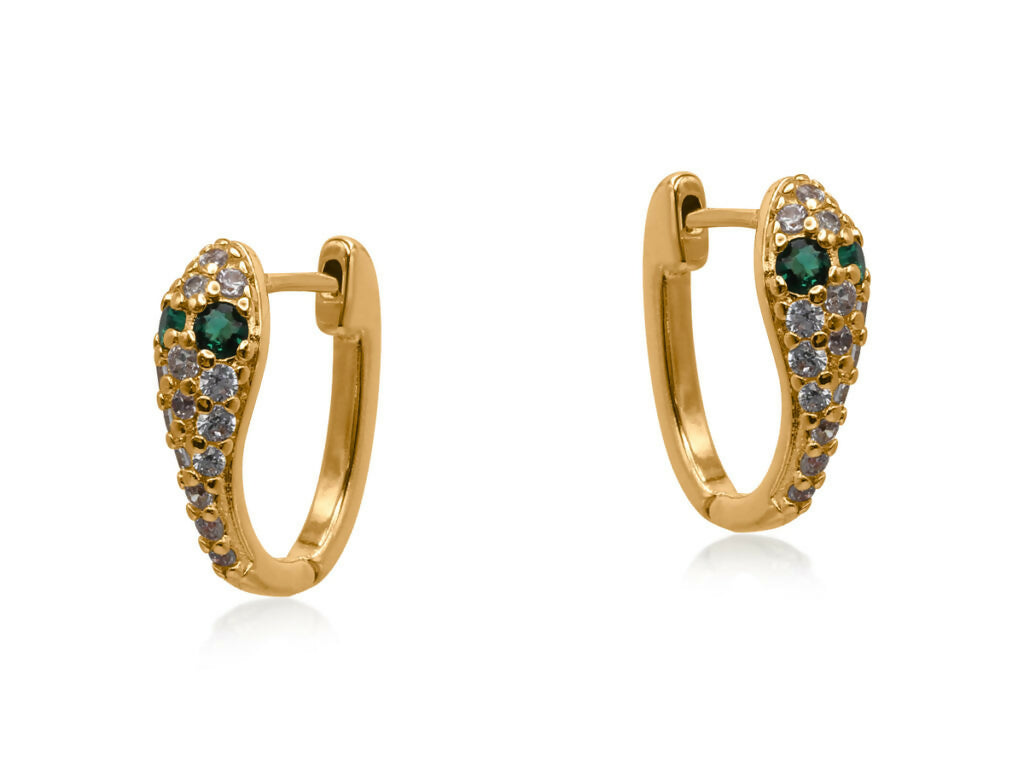 煌めくパヴェストーンとアーモンド型クリスタルの目が印象的な、ヘビを思わせるスリムなフォルムのハンドクラフトハギーピアス。