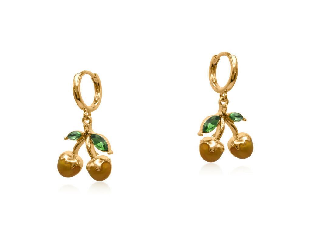 耳元に遊び心を!光沢のあるエナメルフルーツチャームとファセット加工のグリーンリーフが揺れる、ハンドクラフトのハギーピアス。スリムなゴールドフープで、どんなスタイルにも映える可愛さです。