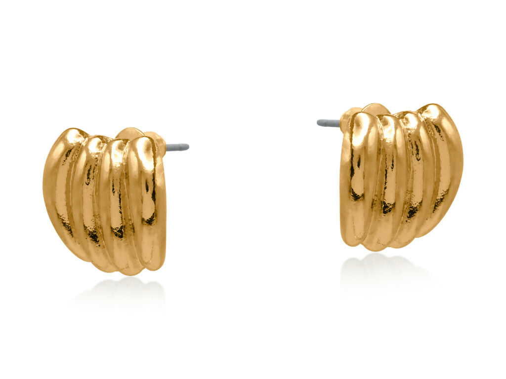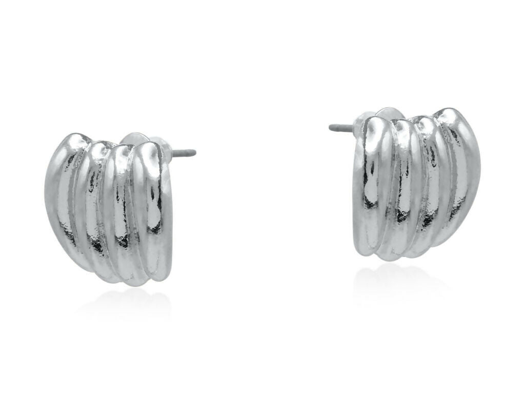 大胆なリブデザインと光沢感のあるハイシャイン仕上げが印象的なハンドクラフトピアス。クラシックなシルエットに彫刻的なアクセントを加え、耳元に立体感と存在感をプラスします。