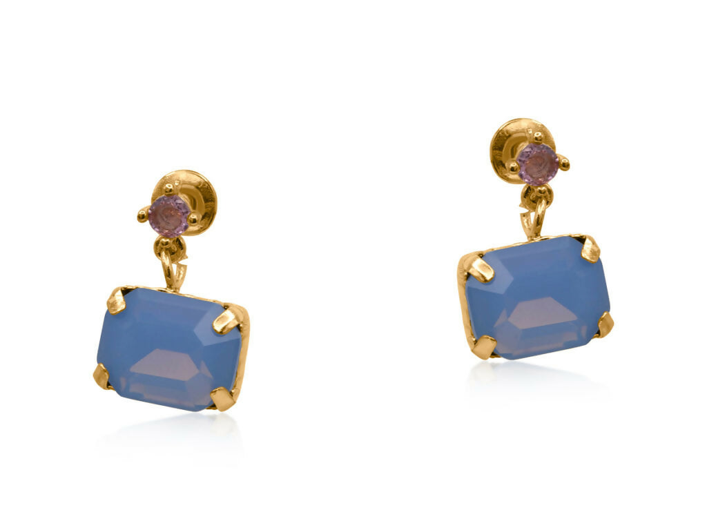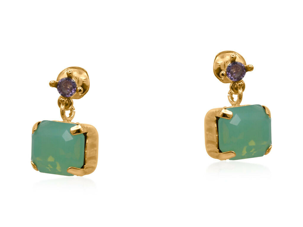 ハンドクラフトのスタッドピアスに、ブリリアントカットガラスとファセット加工の長方形ストーンをあしらいました。柔らかなブルーまたはエメラルドグリーンの2色展開で、耳元にさりげない彩りと上品な輝きをプラスします。