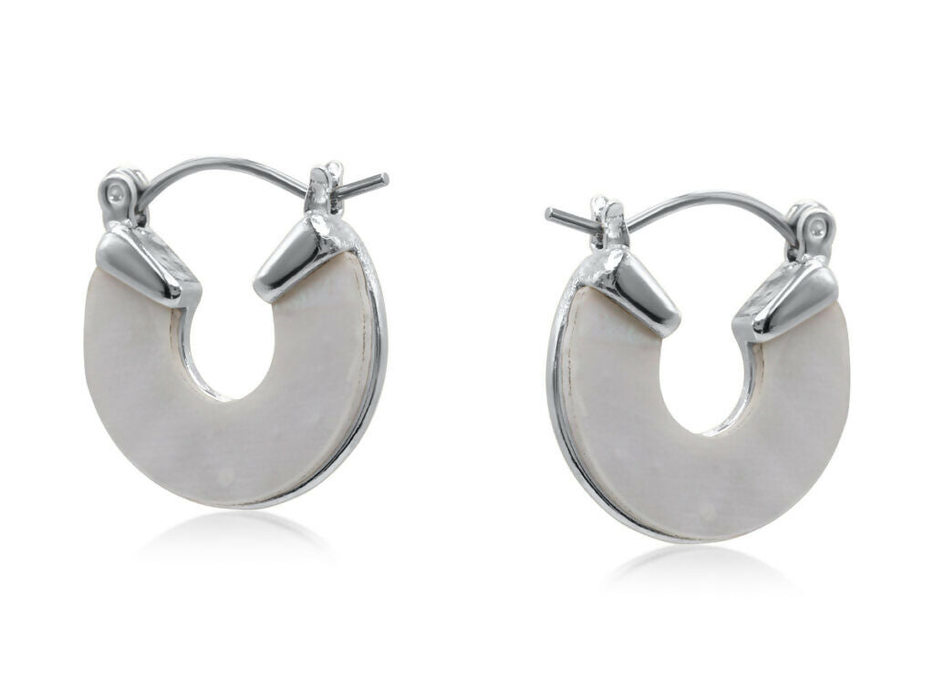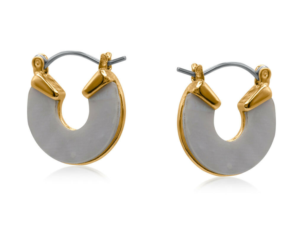 光沢のあるマザーオブパールを使用した、スリムな三日月型フープピアス。ゴールドまたはシルバーのフレームで縁取りされ、クリーンで彫刻的な仕上がりです。