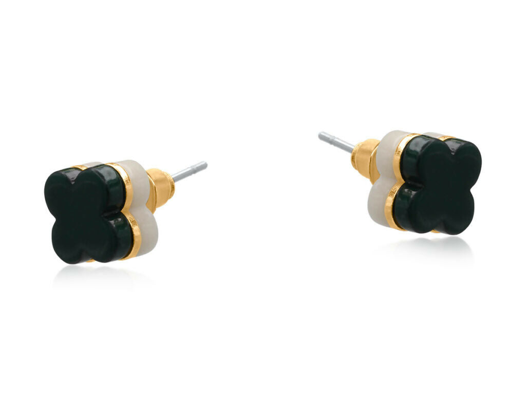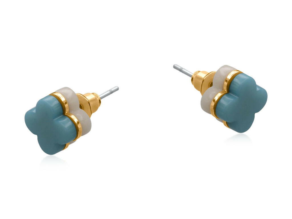 大胆なクローバー型のエナメルスタッドピアス。ブルーまたはエメラルドグリーンのカラーを、光沢のあるゴールドフレームで縁取りました。