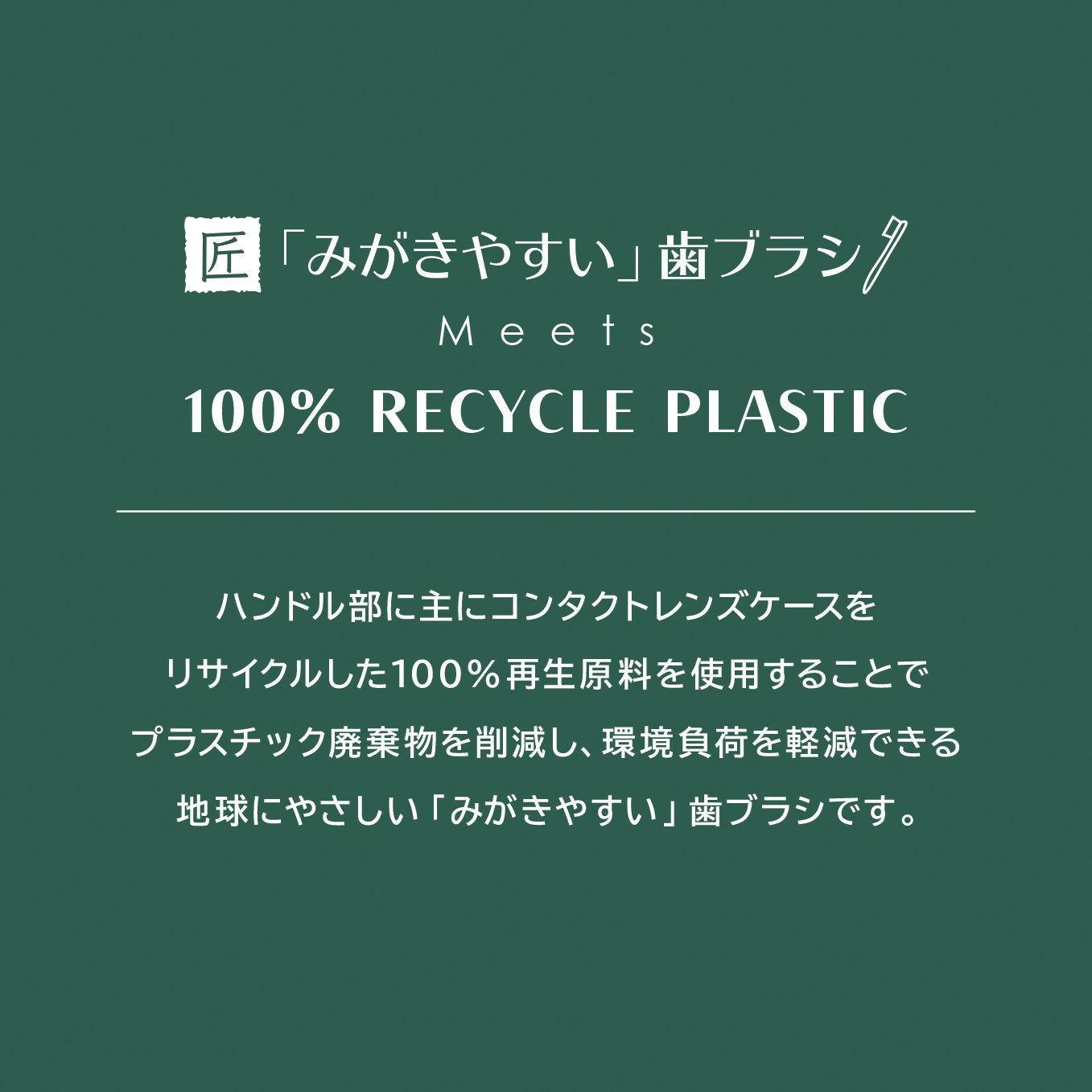 この現状を少しでも改善し持続可能な未来を築くために、主にコンタクトレンズケースをリサイクルした100%再生原料を使用した「みがきやすい」歯ブラシを開発しました。